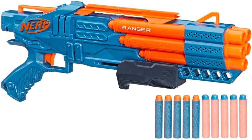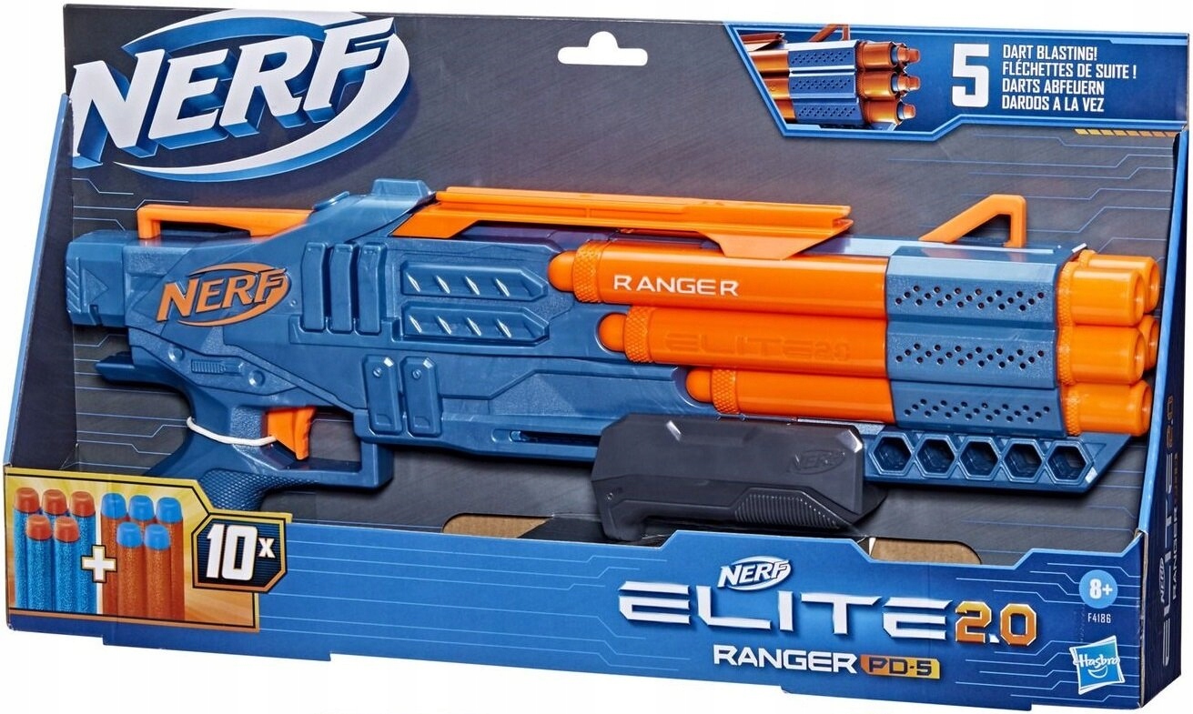 Head into battle with the Nerf Elite 2.0 Ranger PD-5 blaster to take on targets with 5-barrel blasting. Unleash 1 dart at a time from this easy-to-use pump-action blaster that includes 10 Nerf Elite foam darts, giving you 5 darts to load into the blaster and 5 more darts for reloads. You can store those 5 additional darts in the blaster's onboard dart storage to keep them nearby for quick reloading. The Ranger PD-5 blaster is easy to use so you can jump into action fast! Load the barrels, pump the priming slide backward and forward, and pull the trigger to launch 1 dart. The tactical rail and stock attachment point let you customize it for each mission or battle. Build your stockpile of Elite 2.0 blasters to optimize your game strategy and bring tactical performance and flexibility to every Nerf game! Eyewear recommended (not included). Additional accessories sold separately, subject to availability. No batteries required. Nerf and all related properties are trademarks of Hasbro.