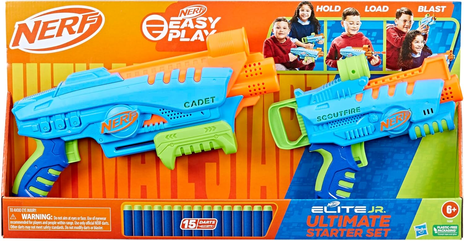 - EASY-PLAY BLASTERS: The 2 toy blasters in this Nerf Elite Jr Ultimate Starter Set have an easy-play design, so kids can enjoy exciting Nerf dart blasting play all on their own in indoor and outdoor games