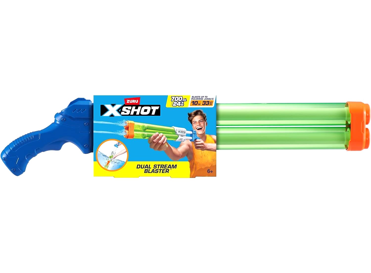 The "Dual Stream Blaster" gun from the Zuru brand, with a 700 ml tank and a 10-meter range for shooting water, gives you a different and exciting game experience.