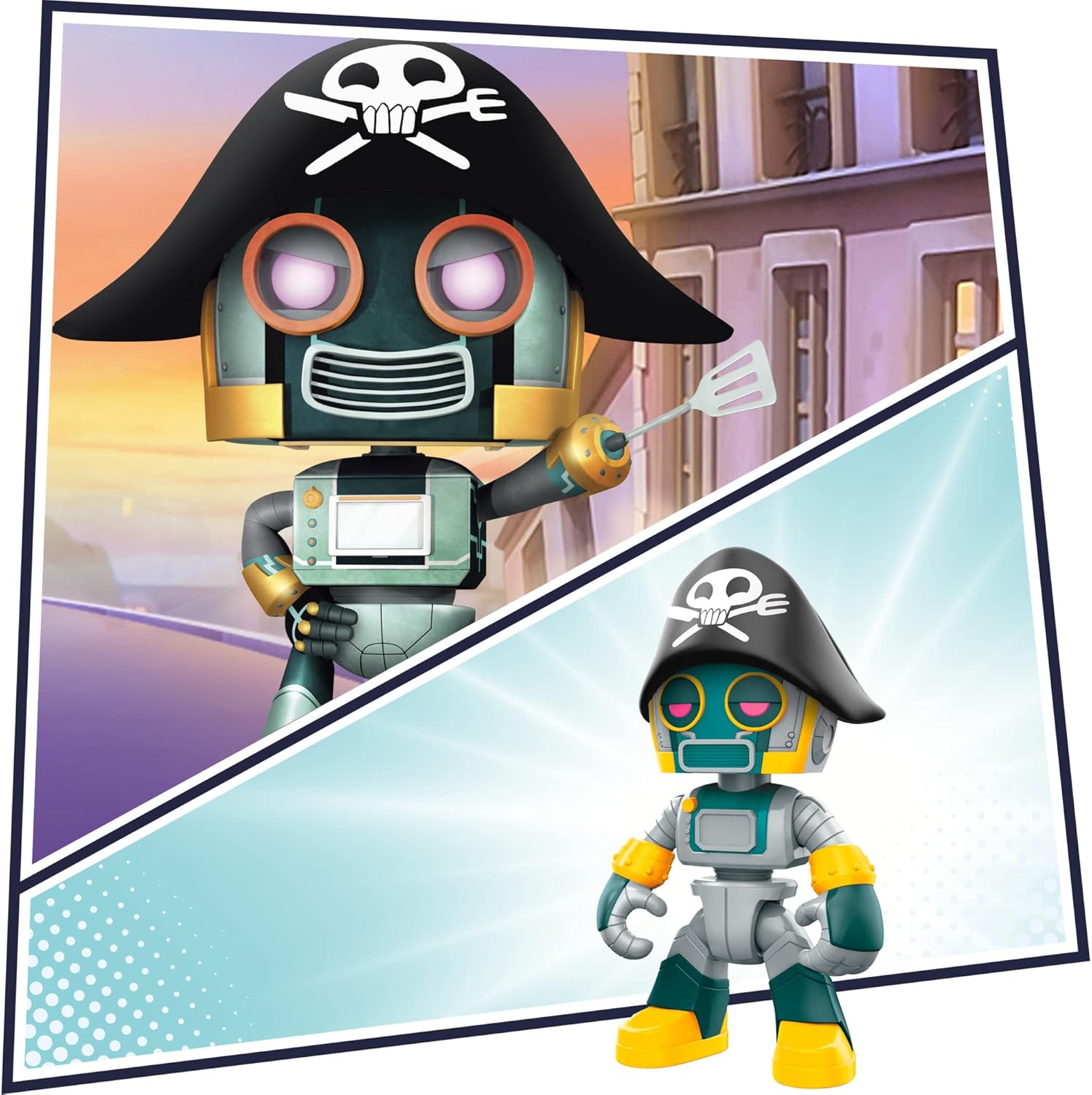 - INCLUDES PIRATE ROBOT FIGURE AND LAUNCHER: Poseable Pirate Robot action figure can hold the spatula launcher accessory Kids can press the button to really launch Pirate Robot’s spatula