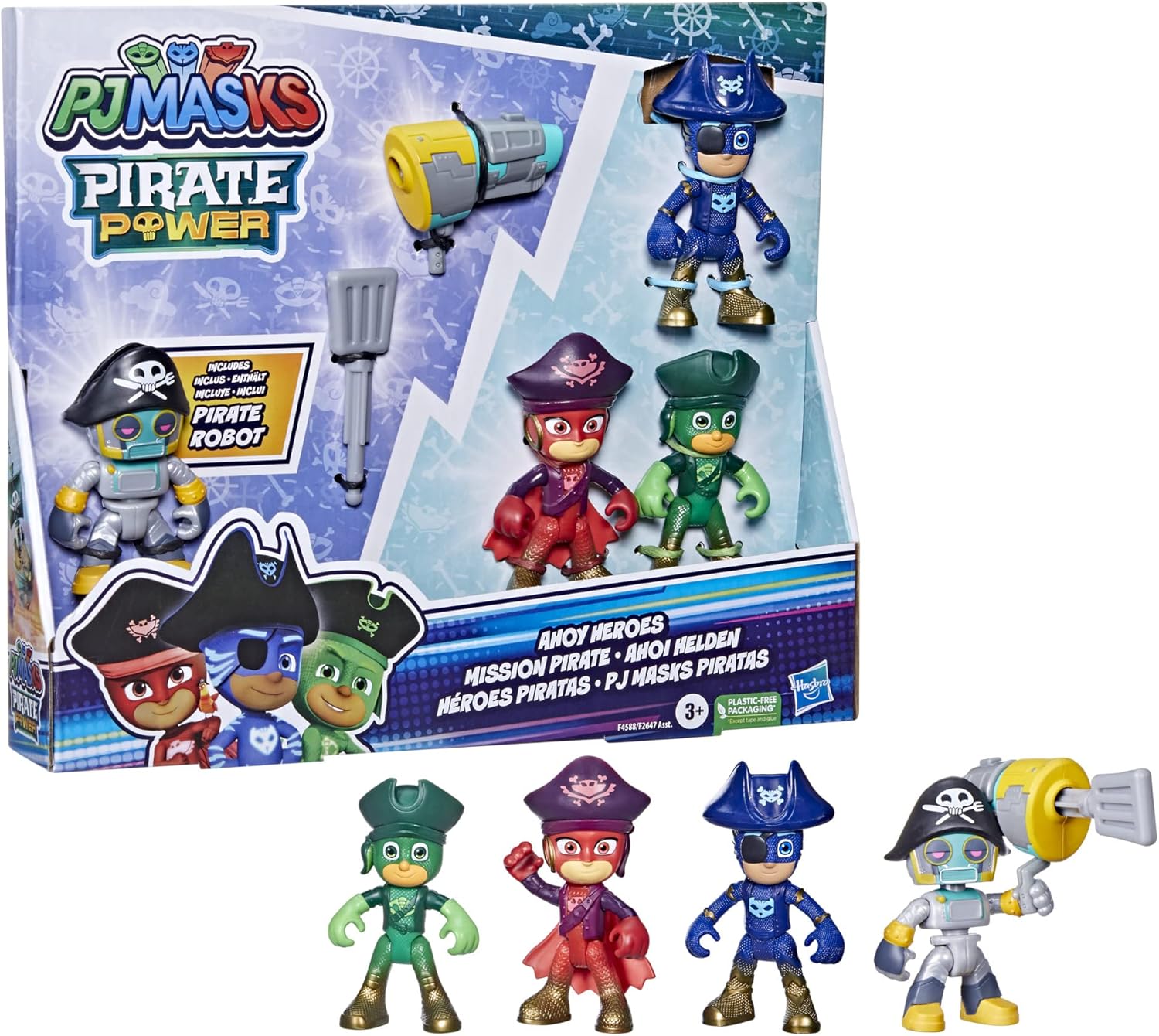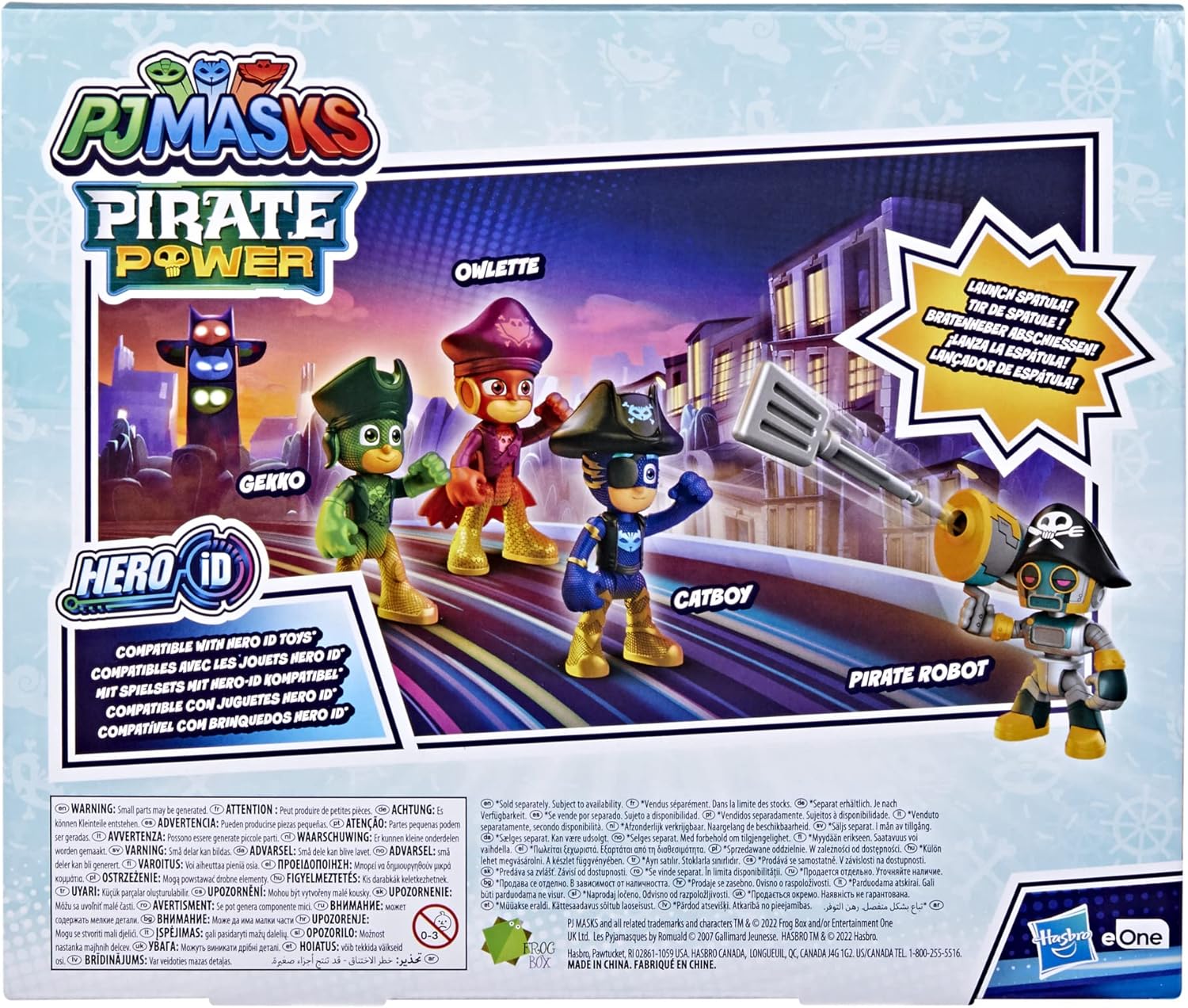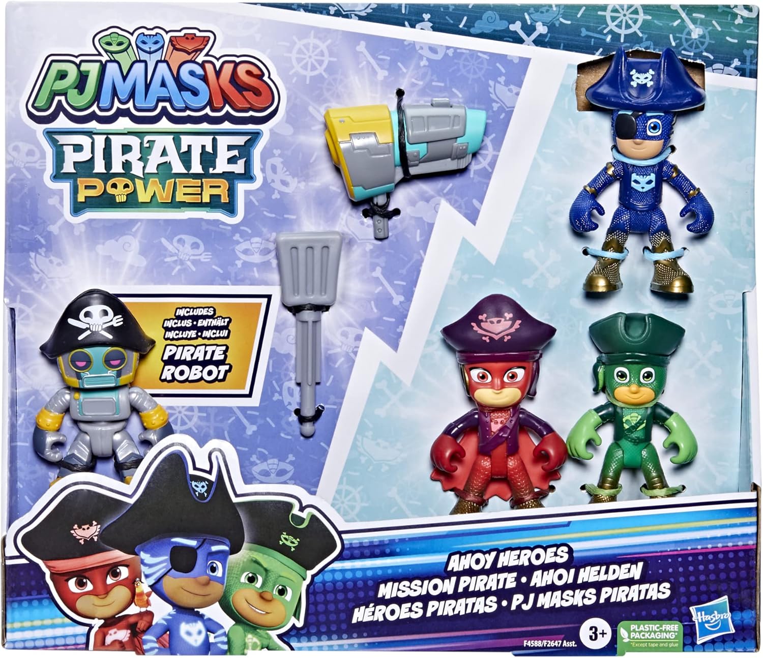 - PJ MASKS MATEYS: This pirate-themed PJ Masks action figure set features all 3 heroes with awesome gold accents and pirate hats, plus a Pirate Robot figure with launcher accessory
