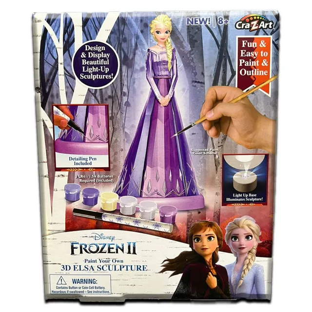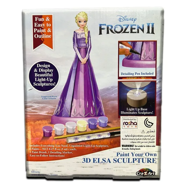 DescriptionDisney Frozen II Paint Your Own 3D Sculpture by Cra-Z-Art! Design and display a beautiful light-up Elsa sculpture! Super cool DIY painting sculpture activity for kids of all ages. Learn how to paint stained-glass while creating 3D artwork with friends and family! Productive and fun way to paint beautiful Frozen II characters!